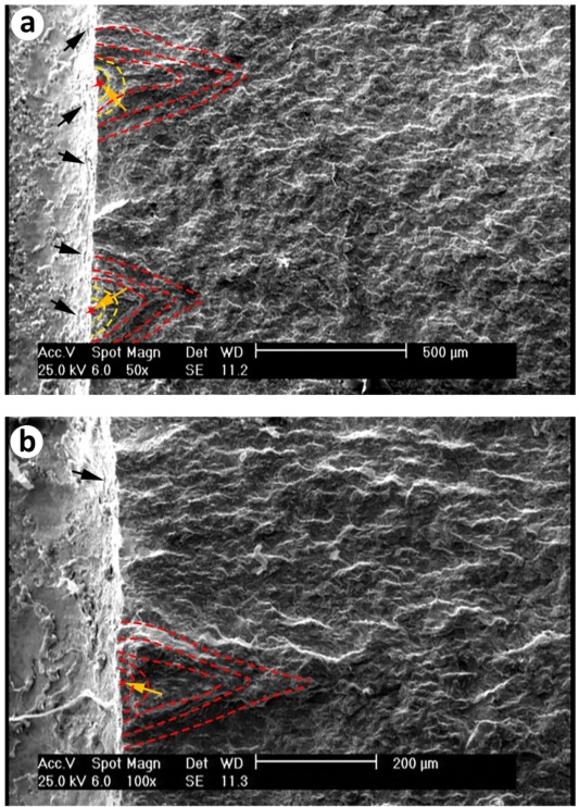 斷裂的沒有珠擊(上)和珠擊(下)試樣的疲勞特性如圖上所示。疲勞條紋(黃色箭頭)