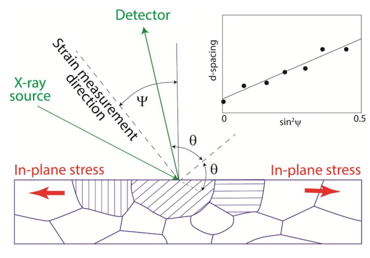 X射線衍射(XRD)以不同的傾斜角度對樣品進行,可以精確檢測傾斜方向原子距離的長度變化。 X 射線衍射依賴多晶材料內的彈性變形來測量材料中的內應力。變形導致晶格平面的間距從無應力值變化到與施加應力的大小相對應的新值。就施加的應力和晶格而言,這種新的間距在任何類似定向的平面中都是相同的, 應力張量是透過在三個不同的分量方向傾斜來計算的。 大多數的量測技術都能夠測量零件中的宏觀殘餘應力,但只有 XRD、中子衍射、同步加速器和拉曼具有測量材料微觀結構內產生的微觀殘餘應力所需的分辨率。