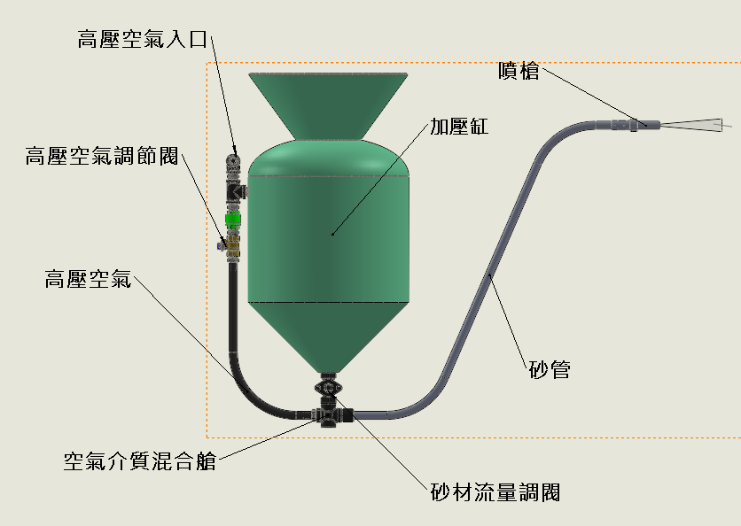高壓空氣係利用空壓設備產生高壓的壓縮空氣或利用高壓氣瓶的空氣和固態介質混合以噴嘴噴出介質來衝擊元件的表面來完成珠擊的做業,這是最典型的珠擊方式。另外一種比較特殊的作業是利用空氣及水來做為珠擊來源的空穴(氣穴)珠擊,係利用負壓的空氣在水中所產生的氣泡來達到珠擊的作業方式。